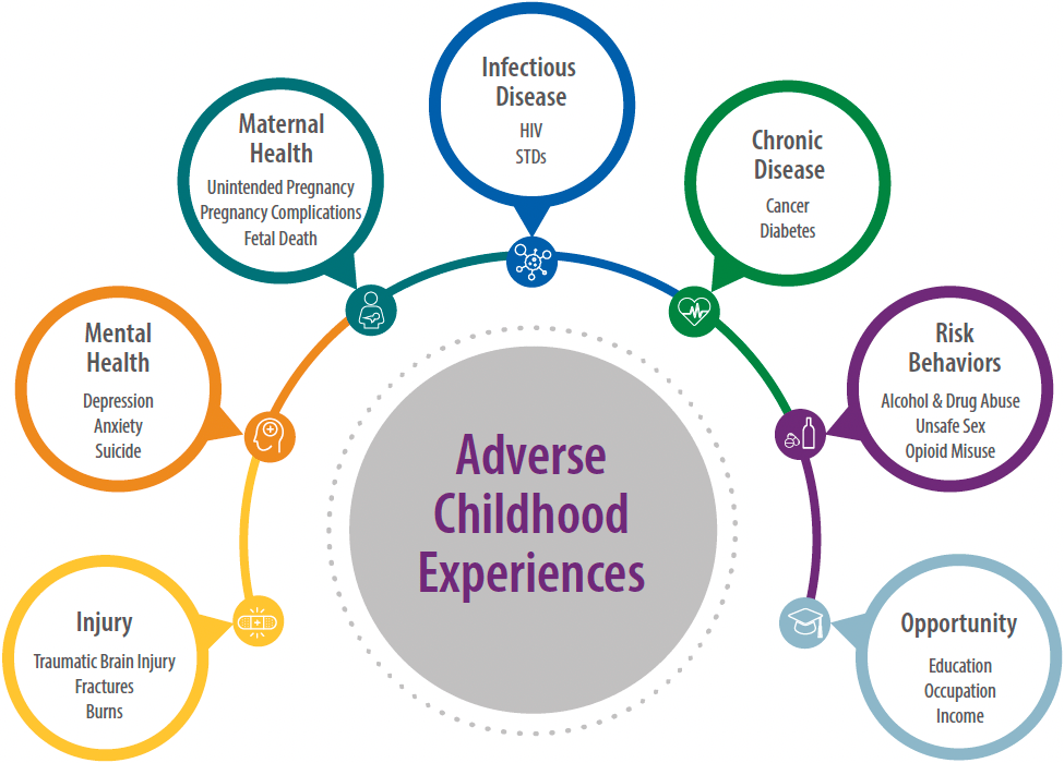 “ACEs” are traumatic events that occur between birth and age 18 that can have lasting effects on health, behavior, and overall life outcomes. The ACE study, conducted in 1998 by the Centers for Disease Control and Prevention (CDC) and Kaiser Permanente, revealed a strong connection between childhood trauma and adult health, demonstrating that preventing and mitigating ACEs is a critical public health priority (CDC, 2024). The effects of ACEs are wide-ranging and long-lasting, influencing physical health, mental well-being, and social functioning across the lifespan. These outcomes are largely driven by toxic stress, a chronic activation of the body’s stress response, which can disrupt healthy brain development and negatively affect multiple bodily systems.